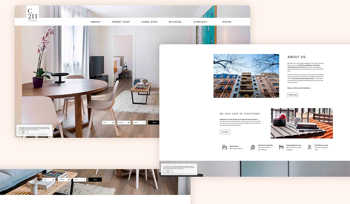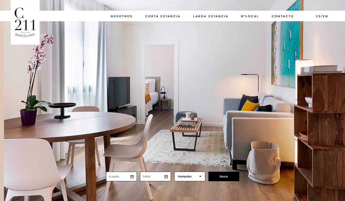 El complejo hotelero de apartamentos C211 Barcelona está situado en una zona priviligiada de la ciudad condal, y requería de un diseño y maquetación web muy limpio y conciso, primando sobre todo las imágenes del complejo de apartamentos. En la web el usuario puede visualizar con todo lujo de detalles los distintos apartamentos que puede alquilar, así como todas las comodidades de que dispone cada uno de ellos.